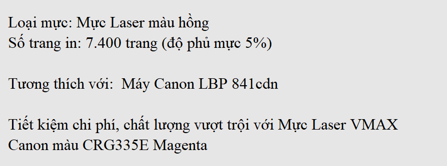 Mực laser Vmax Canon màu CRG335E Magenta là giải pháp hoàn hảo cho dòng mã máy in Canon LBP 841cdn nhờ khả năng vận hành mang lại hiệu suất cao, sự kết hợp tương thích với máy in ưu việt giúp máy tránh các vấn đề hư hỏng và sử dụng bền lâu. Hơn nữa, chất lượng bản in sắc nét với số lượng bản in lớn giúp tiết kiệm chi phí in ấn hiệu quả.