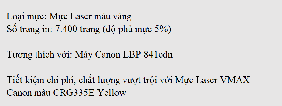 Mực laser Vmax Canon màu CRG335E Yellow là giải pháp hoàn hảo cho dòng mã máy in Canon LBP 841cdn nhờ khả năng vận hành mang lại hiệu suất cao, sự kết hợp tương thích với máy in ưu việt giúp máy tránh các vấn đề hư hỏng và sử dụng bền lâu. Hơn nữa, chất lượng bản in sắc nét với số lượng bản in lớn giúp tiết kiệm chi phí in ấn hiệu quả.