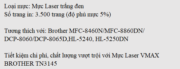 Mực Laser VMAX BROTHER TN3145 là giải pháp hoàn hảo cho các dòng máy in sau: Brother HL5240, HL5250DN, HL5270DN, Brother MFC8460N, MFC8860DN nhờ khả năng vận hành mang lại hiệu suất cao, sự kết hợp tương thích với máy in ưu việt giúp máy tránh các vấn đề hư hỏng và sử dụng bền lâu. Hơn nữa, chất lượng bản in sắc nét với số lượng bản in lớn giúp tiết kiệm chi phí in ấn hiệu quả.