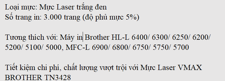 Mực in laser Vmax Brother TN3428 là giải pháp hoàn hảo cho dòng máy in Brother HL-L 6400/ 6300/ 6250/ 6200, Brother HL-L 5200/ 5100/ 5000, Brother MFC-L 6900/ 6800/ 6750/ 5750/ 5700 nhờ khả năng vận hành mang lại hiệu suất cao, sự kết hợp tương thích với máy in ưu việt giúp máy tránh các vấn đề hư hỏng và sử dụng bền lâu. Hơn nữa, chất lượng bản in sắc nét với số lượng bản in lớn giúp tiết kiệm chi phí in ấn hiệu quả.