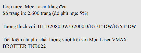 Mực Laser VMAX Brother TNB022 là giải pháp in ấn hoàn hảo cho các dòng máy in Brother nhờ vào khả năng vận hành hiệu quả, sự kết hợp tương thích với máy in ưu việt giúp máy tránh các vấn đề hư hỏng và sử dụng bền lâu. Đây sẽ là lựa chọn tuyệt vời dành cho các doanh nghiệp có nhu cầu in ấn chuyên nghiệp và tiết kiệm tối đa chi phí.