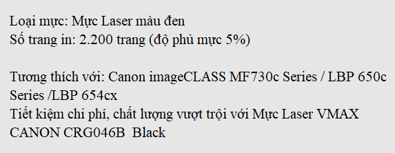 Mực Laser VMAX CANON CRG046BK Black là giải pháp hoàn hảo cho dòng mã máy in Canon imageCLASS MF730c Series / LBP 650c Series / LBP 654cx nhờ khả năng vận hành mang lại hiệu suất cao, sự kết hợp tương thích với máy in ưu việt giúp máy tránh các vấn đề hư hỏng và sử dụng bền lâu. Hơn nữa, chất lượng bản in sắc nét với số lượng bản in lớn giúp tiết kiệm chi phí in ấn hiệu quả.