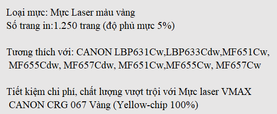 Mực laser VMAX CANON CRG 067 Vàng (Yellow-chíp 100%)