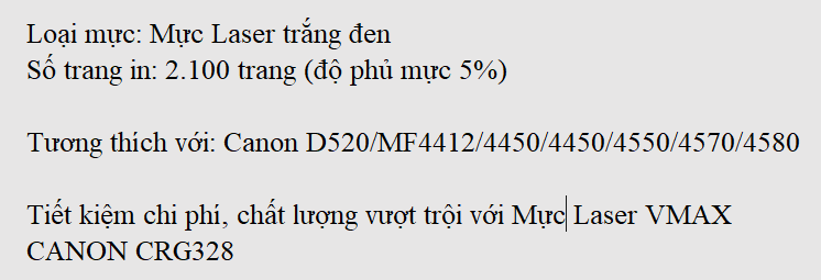 Mực in laser đến từ thương hiệu được sản xuất tuân thủ quy trình của nhà sản xuất gốc, chất lượng sản phẩm đúng tiêu chuẩn Quốc tế. Mực in laser Vmax Canon Cartridge 328 tương thích tốt với các dòng máy in: Canon D520 (EP 328)/MF4412/4450/4450/4550/4570/4580 giúp bạn in ấn linh hoạt mà còn đảm bảo máy ổn định và duy trì thời gian sử dụng máy lâu hơn.