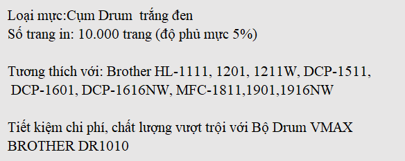 Drum Vmax Brother DR1010 là giải pháp hoàn hảo cho các dòng máy in Brother HL-1111 / DCP 1511 / 1601 / 1616NW / MFC 1811 nhờ khả năng vận hành mang lại hiệu suất cao, sự kết hợp tương thích với máy in ưu việt giúp máy tránh các vấn đề hư hỏng và sử dụng bền lâu. Hơn nữa, chất lượng bản in sắc nét với số lượng bản in lớn giúp tiết kiệm chi phí in ấn hiệu quả.