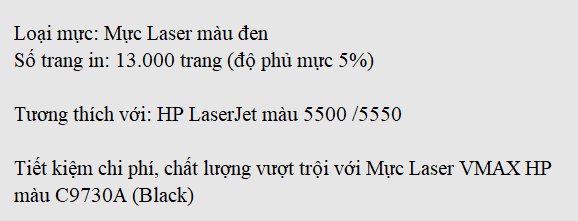 Mực Laser VMAX HP màu C9730A (Black) được sản xuất tuân thủ quy trình của nhà sản xuất gốc, đem đến bạn chất lượng bản in như mực chính hãng. Cho nên, nó không chỉ tương thích tốt với các dòng máy in HP LaserJet màu 5500/ 5550 mà còn đảm bảo máy hoạt động ổn định và duy trì thời gian sử dụng máy lâu hơn.