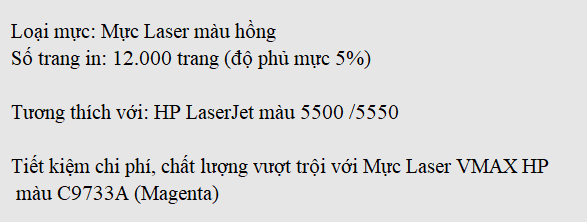 Mực Laser VMAX HP màu C9733A (Magenta) là giải pháp hoàn hảo cho dòng mã máy in sau: máy in HP LaserJet màu 5500/ 5550 nhờ khả năng vận hành mang lại hiệu suất cao, sự kết hợp tương thích với máy in ưu việt giúp máy tránh các vấn đề hư hỏng và sử dụng bền lâu. Hơn nữa, chất lượng bản in sắc nét với số lượng bản in lớn giúp tiết kiệm chi phí in ấn hiệu quả.