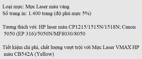Mực Laser VMAX HP màu CB542A (Yellow) (Canon 316Y) là giải pháp hoàn hảo và đồng bộ cho dòng mã máy in sau: HP laser màu CP1215/1515N/1518N và Canon 5050 (EP 316)/5050N/MF8030/8050 nhờ khả năng vận hành mang lại hiệu suất cao, sự kết hợp tương thích với máy in ưu việt giúp máy tránh các vấn đề hư hỏng và sử dụng bền lâu. Hơn nữa, chất lượng bản in sắc nét với số lượng bản in lớn giúp tiết kiệm chi phí in ấn hiệu quả.