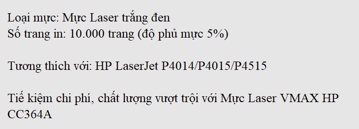 Mực Laser VMAX HP CC364A là giải pháp hoàn hảo cho dòng mã máy in sau: HP LaserJet P4014/P4015/P4515 nhờ khả năng vận hành mang lại hiệu suất cao, sự kết hợp tương thích với máy in ưu việt giúp máy tránh các vấn đề hư hỏng và sử dụng bền lâu. Hơn nữa, chất lượng bản in sắc nét với số lượng bản in lớn giúp tiết kiệm chi phí in ấn hiệu quả.