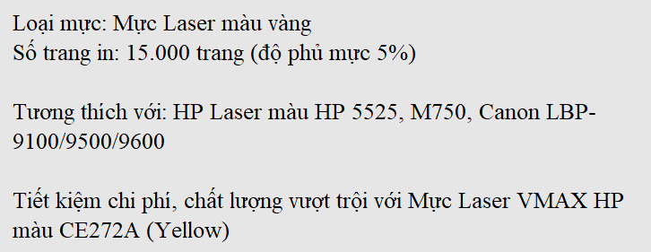Mực Laser VMAX HP màu CE272A (Yellow) là giải pháp hoàn hảo cho các dòng mã máy in sau: HP Laser màu HP 5525 và Canon LBP-9100/9500/9600 nhờ khả năng vận hành mang lại hiệu suất cao, sự kết hợp tương thích với máy in ưu việt giúp máy tránh các vấn đề hư hỏng và sử dụng bền lâu. Hơn nữa, chất lượng bản in sắc nét với số lượng bản in lớn giúp tiết kiệm chi phí in ấn hiệu quả.