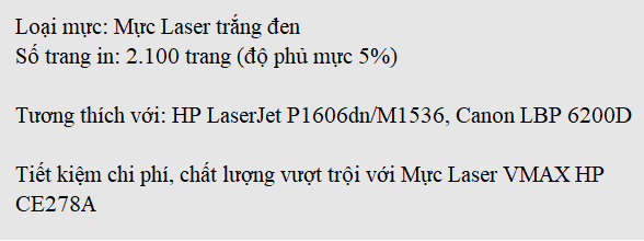 Mực Laser VMAX HP CE278A (Canon 326) là giải pháp hoàn hảo cho dòng mã máy in sau: HP LaserJet P1566/P1606dn/M1536 và Canon LBP 6200D nhờ khả năng vận hành mang lại hiệu suất cao, sự kết hợp tương thích với máy in ưu việt giúp máy tránh các vấn đề hư hỏng và sử dụng bền lâu. Hơn nữa, chất lượng bản in sắc nét với số lượng bản in lớn giúp tiết kiệm chi phí in ấn hiệu quả.