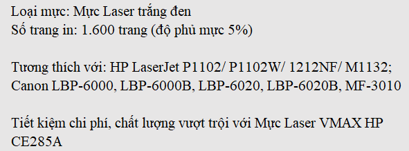 Mực in Laser VMAX HP CE285A (Canon 325) là giải pháp hoàn hảo cho dòng mã máy in sau: HP LaserJet P1102/ P1102W/ 1212NF/ M1132 và Canon LBP-6000, LBP-6000B, LBP-6020, LBP-6020B, MF-3010 nhờ khả năng vận hành mang lại hiệu suất cao, sự kết hợp tương thích với máy in ưu việt giúp máy tránh các vấn đề hư hỏng và sử dụng bền lâu. Hơn nữa, chất lượng bản in sắc nét với số lượng bản in lớn giúp tiết kiệm chi phí in ấn hiệu quả.