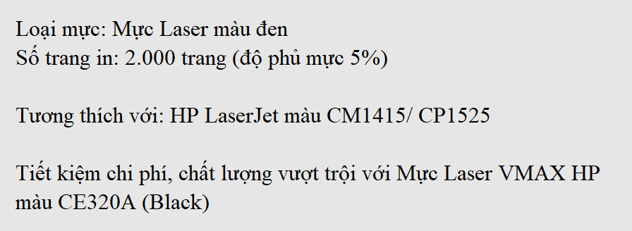 Mực Laser VMAX HP màu CE320A (Black) được sản xuất tuân thủ quy trình của nhà sản xuất gốc, đáp ứng tốt về độ tương thích và chất lượng màu in. Sản phẩm mực in laser này Vmax còn giúp cho máy in vận hành ổn định, hạn chế hư hỏng và duy trì độ bền lâu hơn mà còn tương thích tốt với các dòng máy in mã: HP LaserJet màu CM1415 và HP LaserJet màu CP1525.