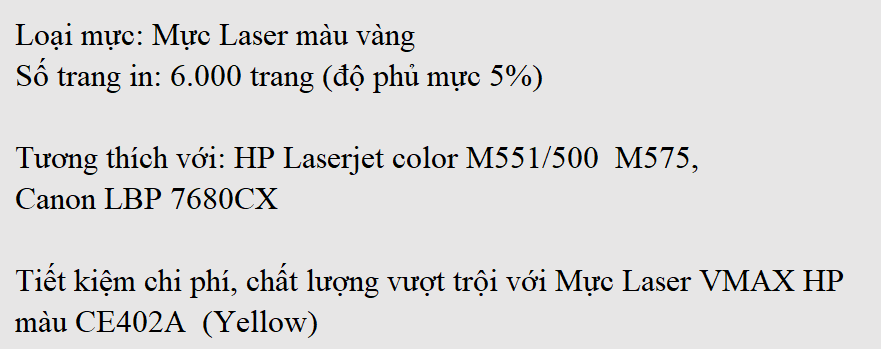 Mực Laser VMAX HP màu CE402A (Yellow) với chất lượng quốc tế và đáp ứng nhu cầu in ấn tiết kiệm cho mọi doanh nghiệp, mực in Vmax trở thành sự lựa chọn hoàn hảo giúp sở hữu bản in màu chuyên nghiệp và giúp máy in vận hành ổn định, gia tăng độ bền.