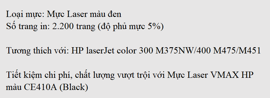 Mực Vmax hiện là thương hiệu mực in tương thích số 1 Việt Nam (do AC Nielsen thông kê 2009). Vì thế, người dùng có thể an tâm tuyệt đối về sản phẩm mực in laser của thương hiệu Vmax. Quy trình sản xuất của Vmax tuân thủ đúng quy trình của nhà sản xuất gốc, đạt tiêu chuẩn chất lượng Quốc tế. Nó còn giúp cho máy in vận hành ổn định và duy trì độ bền lâu hơn. Dòng mực in laser này tương thích tốt với các dòng máy in mã HP laserJet color 300 MFP M375NW, HP laserJet color 400 MFP M475, M451.