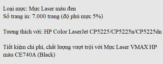 Mực Laser VMAX HP màu CE740A (Black) là giải pháp hoàn hảo cho dòng máy in HP laser màu CP 5225 nhờ khả năng vận hành mang lại hiệu suất cao, sự kết hợp tương thích với máy in ưu việt giúp máy tránh các vấn đề hư hỏng và sử dụng bền lâu. Hơn nữa, chất lượng bản in sắc nét với số lượng bản in lớn giúp tiết kiệm chi phí in ấn hiệu quả.