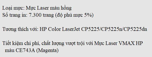 Quy trình sản xuất mực Vmax tuân thủ đúng quy trình của nhà sản xuất gốc, đạt tiêu chuẩn chất lượng Quốc tế. Mực Laser VMAX HP màu CE743A (Magenta) tương thích tốt với dòng máy in HP laser màu CP 5225 giúp cho máy in vận hành ổn định và duy trì độ bền lâu hơn. Mực Vmax hiện là thương hiệu mực in tương thích số 1 Việt Nam (do AC Nielsen thống kê 2009). Vì thế, người dùng có thể an tâm tuyệt đối về sản phẩm.