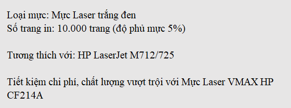 Lựa chọn mực in vừa năng suất cao vừa tiết kiệm chi phí là là nhu cầu vô cùng cần thiết của hầu hết các cá nhân và doanh nghiệp. Mực Laser VMAX HP CF214A đến từ thương hiệu Vmax là loại mực tiêu chuẩn chất lượng Quốc tế, độ tương thích hoàn hảo với máy in mang đến sự an tâm tuyệt đối cho người dùng.