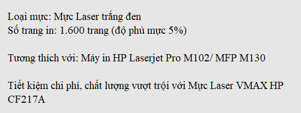 Mực Laser VMAX HP CF217A (17A) đáp ứng các thông số kỹ thuật chính xác giống như nhà sản xuất gốc, giúp chất lượng bản in luôn cao nhất. và đồng bộ tương thích với dòng máy in HP LaserJet Pro M102/ M104/ M106/ M130/ M132/ M134 đảm bảo sự hoạt động ổn định và hạn chế tối đa lỗi.