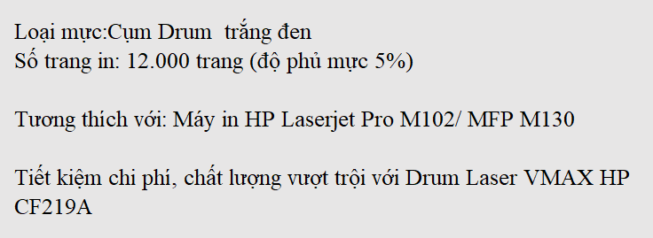 Sản phẩm Drum mực được Vmax sản xuất tuân thủ quy trình của nhà sản xuất gốc, nguyên liệu nhập khẩu chất lượng, Drum Laser Vmax HP CF219A tạo sự tương thích tốt nhất cho các dòng máy in HP LaserJet Pro M102/ M104/ M106/ M130/ M132/ M134. giúp máy in của bạn sẽ vận hành tốt hơn, in ấn hiệu quả  và hạn chế tối đa hư hỏng.