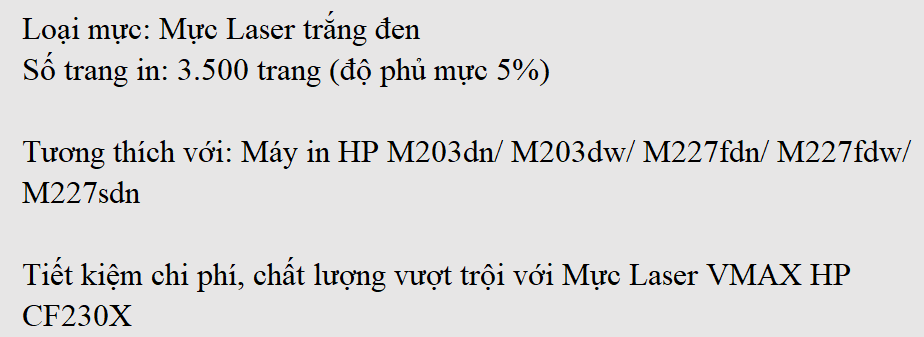 Mực in laser là gợi ý hoàn hảo cho văn phòng cũng như cá nhân in ấn đòi hỏi cao về chất lượng bản in trắng đen. Mực in laser Vmax HP CF230X mang lại những bản in sắc nét cho hội họp, giao dịch với khách hàng và cả lĩnh vực sáng tạo và giúp các thiết bị in ấn hoạt động ổn định, hạn chế các lỗi phát sinh mang đến sự an tâm tuyệt đối khi sử dụng.