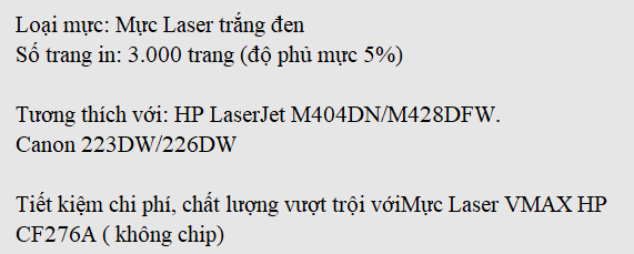 Mực Laser VMAX HP CF276A (không chip) còn được gọi là HP 76A, là một loại mực đáng tin cậy được sử dụng phổ biến cho các dòng máy in laser HP. Đây là một sản phẩm chất lượng cao và là lựa chọn lý tưởng cho các văn phòng và cá nhân có nhu cầu in ấn chất lượng cao.