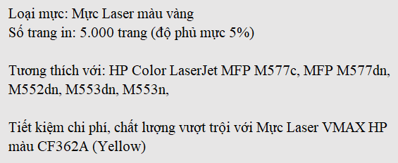 Mực Laser VMAX HP màu CF362A (Yellow) là giải pháp hoàn hảo cho các dòng máy in HP LaserJet Enterprise M552DN và máy in HP LaserJet Enterprise M553DN nhờ khả năng vận hành mang lại hiệu suất cao, sự kết hợp tương thích với máy in ưu việt giúp máy tránh các vấn đề hư hỏng và sử dụng bền lâu. Hơn nữa, chất lượng bản in sắc nét với số lượng bản in lớn giúp tiết kiệm chi phí in ấn hiệu quả.