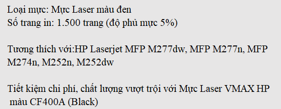 Mực Laser VMAX HP màu CF400A (Black) là giải pháp hoàn hảo cho các dòng máy in: HP laser màu M252 / M277 nhờ khả năng vận hành mang lại hiệu suất cao, sự kết hợp tương thích với máy in ưu việt giúp máy tránh các vấn đề hư hỏng và sử dụng bền lâu. Hơn nữa, chất lượng bản in sắc nét với số lượng bản in lớn giúp tiết kiệm chi phí in ấn hiệu quả.