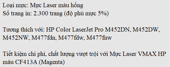 Mực Laser VMAX HP màu CF413A (Magenta) đạt hiệu quả cao về chất lượng mực, màu sắc thể hiện và hiệu suất in ấn. Sản phẩm mang đến người dùng tối đa 2.300 trang tài liệu chuẩn nét (với trang in độ phủ mực 5% theo tiêu chuẩn ISO/IEC 19752). Hộp mực in laser có mức giá hợp lý giúp doanh nghiệp và cá nhân tiết kiệm chi phí in ấn tới 30% - 60%.