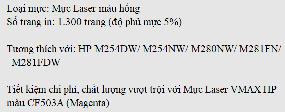 Mực in laser màu Vmax HP CF503A - Magenta là giải pháp hoàn hảo cho dòng máy in: HP M254DW/ M254NW/ M280NW/ M281FN/ M281FDW nhờ khả năng vận hành mang lại hiệu suất cao, sự kết hợp tương thích với máy in ưu việt giúp máy tránh các vấn đề hư hỏng và sử dụng bền lâu. Hơn nữa, chất lượng bản in sắc nét với số lượng bản in lớn giúp tiết kiệm chi phí in ấn hiệu quả.