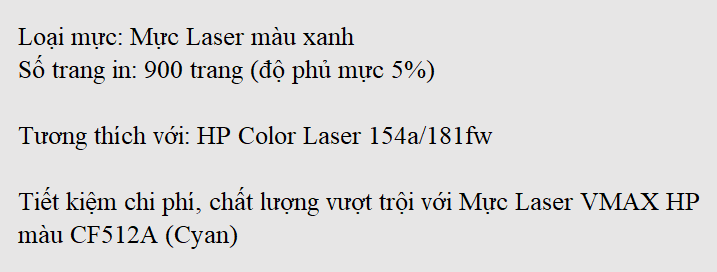 Mực in Vmax hiện là thương hiệu mực in tương thích số 1 Việt Nam (do AC Nielsen thống kê tháng 11/2009). Dòng mực in Vmax còn đảm bảo cho máy hoạt động ổn định, hạn chế tối đa tình trạng kẹt giấy và các lỗi in ấn. Mực in laser màu Vmax HP CF511A - Cyan thiết kế dành cho dòng máy in HP LaserJet M154, M180, M181 Cyan Cartridge (900 pages).