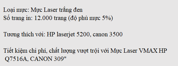 Mực Laser VMAX HP Q7516A (Canon 309) chất lượng tương tự mực in chính hãng, mang đến bạn những bản in sắc nét, bền màu trong thời gian dài. Mực in laser Vmax HP Q7516A (Canon 309) đồng bộ hoàn hảo với những mã máy in HP LaserJet 5200/5200TN/5200DTN, Canon LBP 3500 (EP 309). Theo thống kê của AC Nielsen thì Vmax là thương hiệu tương thích số 1 Việt Nam.