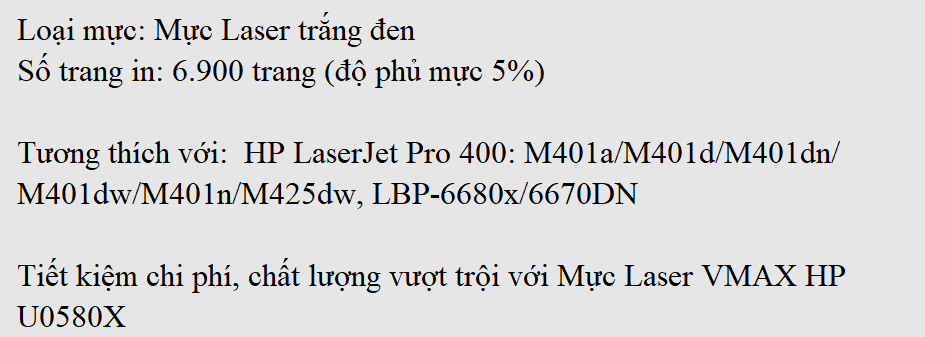 Mực Laser VMAX HP U0580X chất lượng tương tự mực in chính hãng, đặc biệt khá thân thiện với môi trường và không độc hại đối với người dùng. Bản in ra đạt độ sắc nét đúng yêu cầu, bền màu trong thời gian dài. Dòng mực này đồng bộ hoàn hảo với những mã máy in sau: HP Laserjet P2050 series P2053,P2054, P2055; HP LaserJet Pro 400: M401a, M401d, M401dn, M401dw, M401n, M425dn MFP, M425dw MFP; Canon Sensys: LBP-6680x, LBP-6670DN, MF5840, MF5840DN, MF5880, MF5880DN, LBP-6300, LBP-6650, MF5980DW, MF5940DN, MF-5980DW.