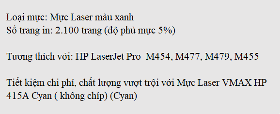 Mực in Vmax hiện là thương hiệu mực in tương thích số 1 Việt Nam (do AC Nielsen thống kê tháng 11/2009). Mực in laser Vmax còn đảm bảo cho máy hoạt động ổn định, hạn chế tối đa tình trạng kẹt giấy và các lỗi in ấn. Dòng sản phẩm mực Laser VMAX HP 415A Cyan này thiết kế dành cho dòng máy in HP Color LaserJet Pro M454nw / M454dn / M454dw / M479fnw / M479fdw.