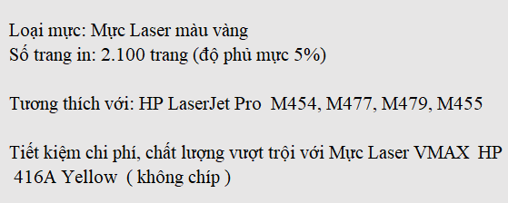 Mực in Vmax hiện là thương hiệu mực in tương thích số 1 Việt Nam (do AC Nielsen thống kê tháng 11/2009). Dòng mực in Vmax còn đảm bảo cho máy hoạt động ổn định, hạn chế tối đa tình trạng kẹt giấy và các lỗi in ấn. Mực Laser VMAX HP 416A Yellow thiết kế dành cho dòng máy in laser màu của các máy: HP Color LaserJet Pro M454nw / M454dn / M454dw / M479fnw / M479fdw.