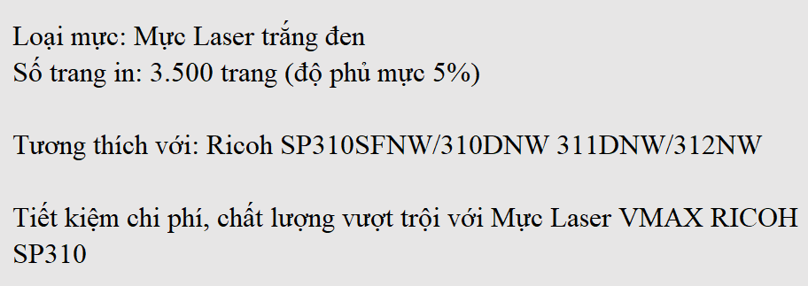 Mực in laser Vmax Ricoh SP310 đáp ứng các tiêu chí về độ đậm đen, nạp mực liên tục, độ bám dính cao và ít mực thải. Vmax Ricoh SP310 được sản xuất tuân thủ quy trình của nhà sản xuất gốc nên tương thích tuyệt đối với các dòng máy in tương ứng, giảm lỗi in ấn và duy trì độ bền của máy. Mực in Vmax không gây mùi khó chịu, thân thiện với môi trường và sức khỏe con người.