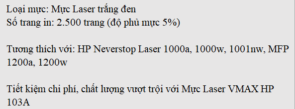 Loại mực này chất lượng tương tự mực in chính hãng, mang đến bạn những bản in sắc nét, bền màu trong thời gian dài. Mực in laser Vmax HP 103A đồng bộ hoàn hảo với những mã máy in HP LaserJet 1000W/12000W.