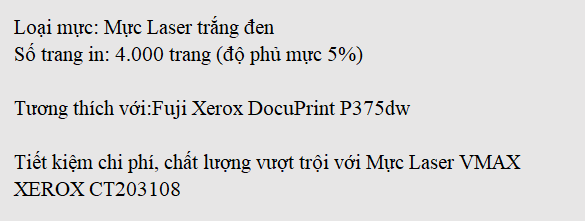 Mực in laser đến từ thương hiệu Vmax là dòng mực in tương thích chất lượng hàng đầu Việt Nam. Sản phẩm duy trì hoạt động in ấn, hơn nữa chất lượng và dung lượng mực đạt chuẩn như mực OEM, đặc biệt giúp doanh nghiệp tiết kiệm đến 30-60% chi phí in ấn.
