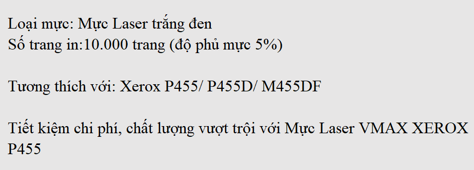 Mực in laser Vmax Xerox P455 (CT201948) là loại mực in chất lượng tốt đáp ứng các tiêu chuẩn Quốc tế giúp bạn an tâm tuyệt đối khi in ấn với các mã máy Xerox P455/ P455D/ M455DF. Mực in laser của thương hiệu Vmax có ưu điểm tươi nét, không lem nhòe hay vón cục, đảm bảo bản in rõ nét, bền màu. Hơn nữa, mực in laser Vmax có giá tốt nhất thị trường giúp người dùng tiết kiệm chi phí từ 30-60%.