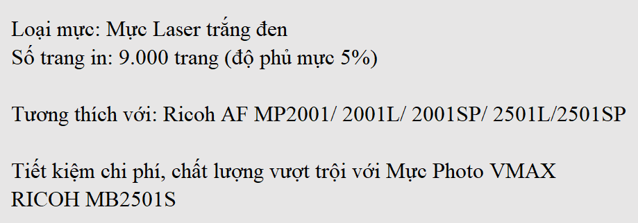 Mực in Vmax hiện là thương hiệu mực in tương thích số 1 Việt Nam (do AC Nielsen thống kê tháng 11/2009). Dòng mực photo Vmax đạt tiêu chuẩn chất lượng Quốc tế đảm bảo tính tương thích và số lượng trang in như mực OEM. Mực photocopy Vmax Ricoh MB 2501S tương thích tốt với dòng máy photo Ricoh AF MP2001 / 2001L / 2001SP / 2501L /2501SP.