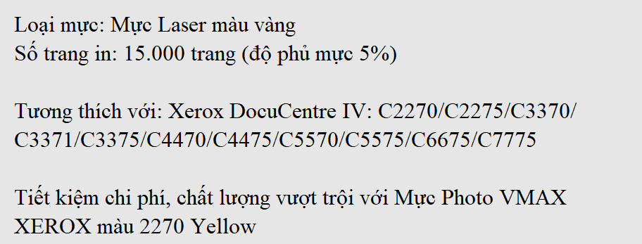 Mực photocopy màu Vmax Xerox 2270 - Yellow là giải pháp hoàn hảo cho dcacs dòng máy Xerox DocuCentre IV/ApeosPort IV: C2270, C2275, Xerox DocuCentre IV/ApeosPort IV: C3370, C3371, C3373, C3375, Xerox DocuCentre IV/ApeosPort IV: C4470, C4475, Xerox DocuCentre IV/ApeosPort IV: C5570, C5575, C6675, C7775 nhờ khả năng vận hành mang lại hiệu suất cao, sự kết hợp tương thích với máy ưu việt giúp máy tránh các vấn đề hư hỏng và sử dụng bền lâu. Hơn nữa, chất lượng sắc nét với số lượng lớn giúp tiết kiệm chi phí in ấn hiệu quả.