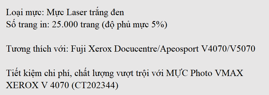 Được sản xuất với công nghệ từ Mỹ và nguyên liệu nhập khẩu từ Nhật Bản theo tiêu chuẩn chất lượng quốc tế, hiệu suất in ấn tốt và độ tương thích tuyệt đối với máy, mực photocopy Vmax Xerox CT202344 là sự lựa chọn lý tưởng cho bạn khi dùng các dòng máy photo Fuji Xerox Docucentre/Apeosport V4070/V5070. Sản phẩm mực photocopy Vmax Xerox còn giúp máy in hoạt động ổn định, hạn chế lỗi và các vấn đề hỏng hóc xảy ra khi in ấn.